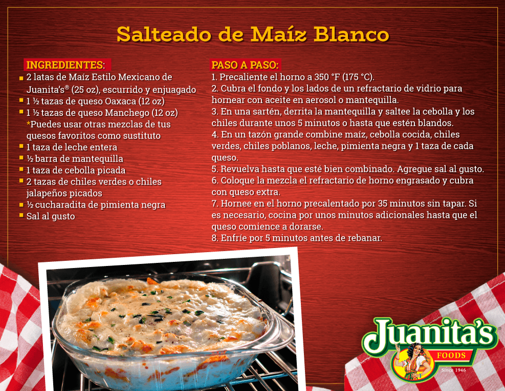 - 2 latas de Maíz Estilo Mexicano de Juanita’sⓇ (25 oz), escurrido y enjuagado