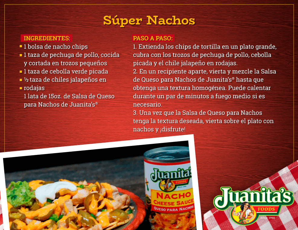 En un recipiente aparte, vierta y mezcle la Salsa de Queso para Nachos de Juanita’sⓇ hasta que obtenga una textura homogénea. Puede calentar durante un par de minutos a fuego medio si es necesario.