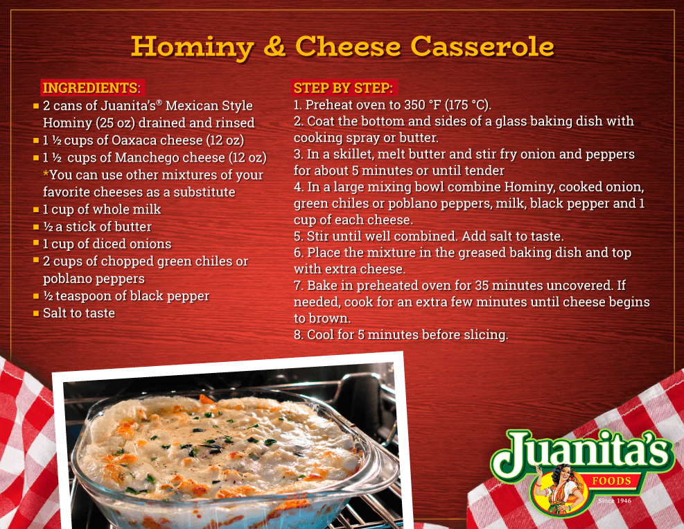 - In a large mixing bowl combine Hominy, cooked onion, green chiles or poblano peppers, milk, black pepper and 1 cup of each cheese.